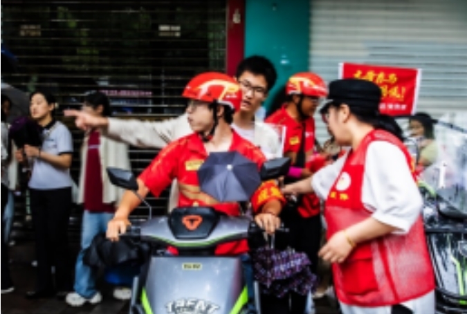 合肥三中考點外,志愿者大姐著急地帶著一名忘帶身份證的考生,向京東外賣全職騎手小隊求助。范春林立馬騎車帶著考生去最近的逍遙津派出所辦理臨時身份證,并于8:30將該考生安全送回考場。